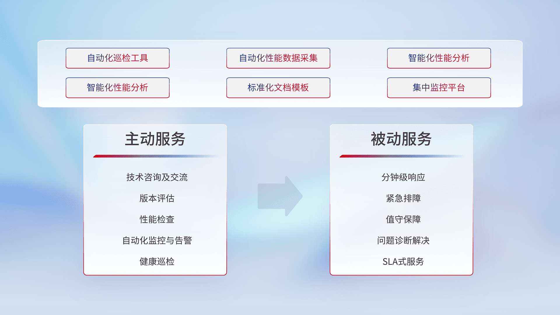 智能化工具和标准化文档,,保障服务质量,,提供主动服务(包含技术咨询、、、版本评估、、、、性能检查、、、、自动化监控与告警、、健康巡检)和被动服务包含(分钟级响应、、、紧急排障、、、、值守保障、、、、问题诊断解决、、、SLA服务)。。