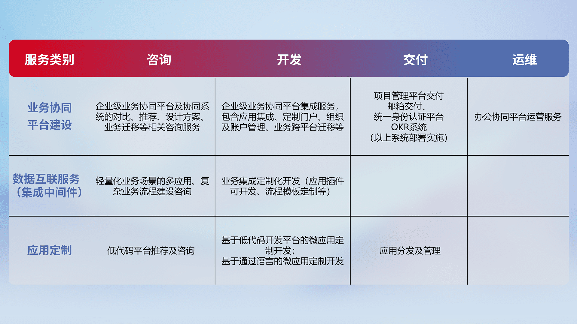 针对钉钉、、、企微、、、、IDaas等平台级产品提供产品的规划、、、、方案、、、交付、、、、定制化开发等服务,,,,实现如统一协同办公、、、智能客户服务、、、、混合会议管理、、智能数据查询、、、、等业务场景,,,实现数字化转型。。